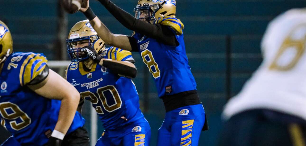 San Nicolás de los Garza, N. L., a 4 de abril de 2025.- Lo que prometía un inicio espectacular para los pedregalinos, al sorprender en su primer drive a los Auténticos Tigres con pase de 81 yardas de Emiliano Sánchez (10) a Bruno Said Granados (12), para irse al frente 0-7 con el extra de José Ángel Rodríguez (14), tuvo inmediata respuesta por parte de los dirigidos del HC Rolando Piña.